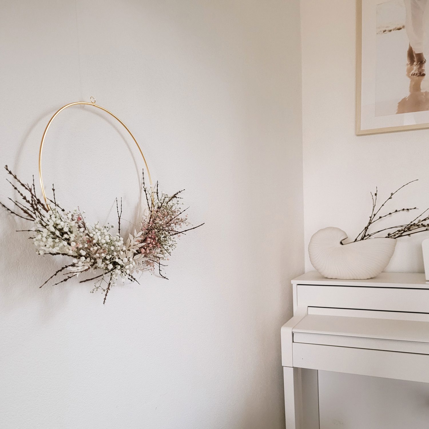 Végül a koszorú tetejére zsinórt kötünk és felakasztjuk.