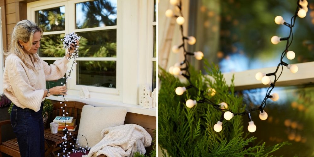 A hűvösebb napokon is imádok kiülni egy bögre teával, ezért a kerti padomat puha párnákkal és meleg takaróval tettem hívogatóvá. A kültérre is alkalmas, apró gömbös fényfüzért maszkolószalaggal rögzítettem az ablakra, mert így nem hagy nyomot, ha később eltávolítom. A kerámia házikók már évek óta a kedvenceim, most pedig új társakat kaptak: néhány kerámia gombát, amiket nemrég fedeztem fel. Ezek együtt varázsolják otthonossá és egyedivé a kis kuckómat.