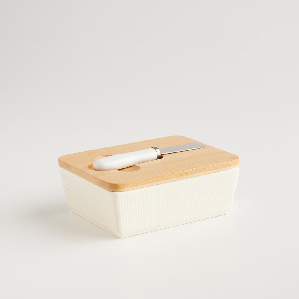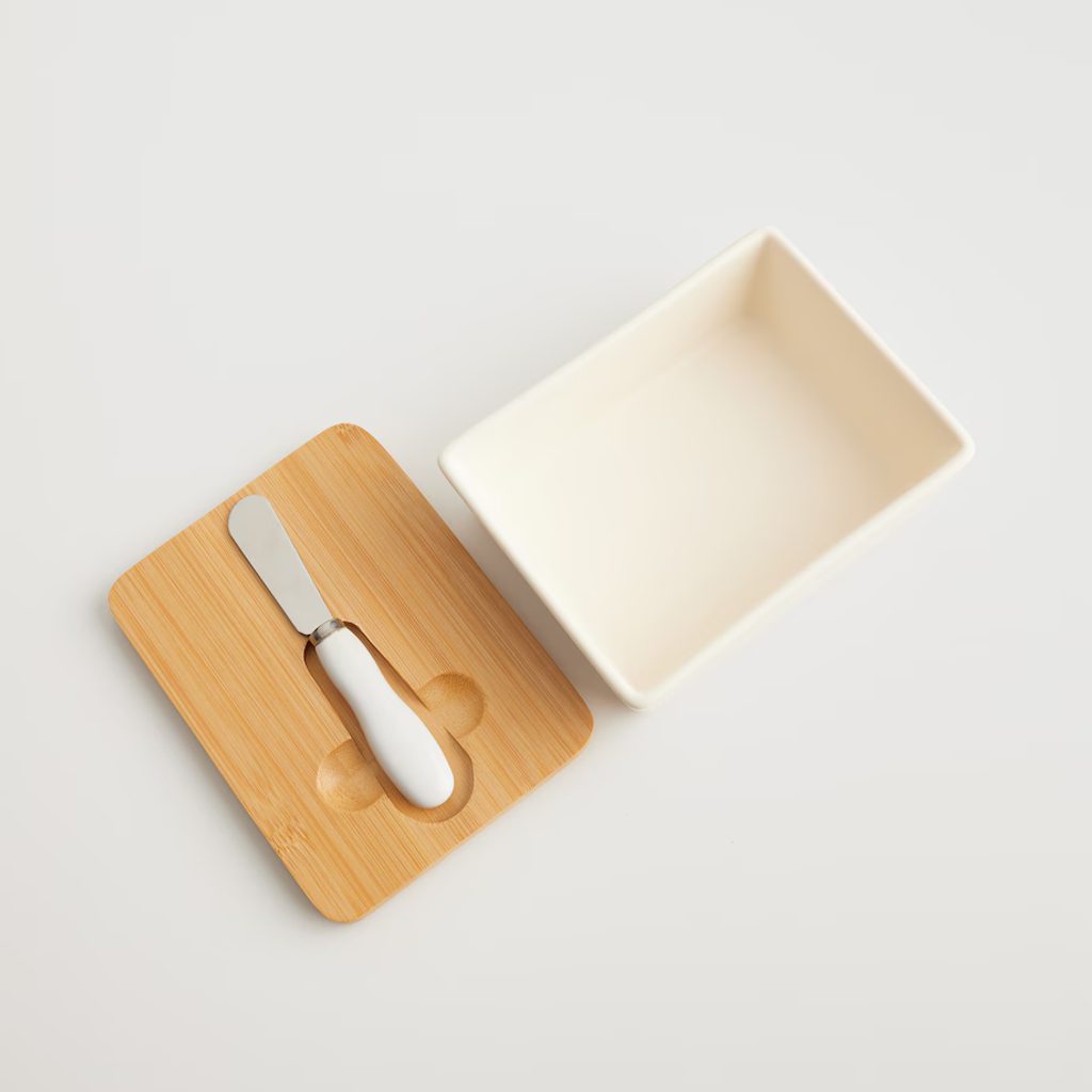 Bézs kerámia és a természetes bambusz találkozása: ebben a vajtartóban stílusosan tálalhatod a vajat a reggeliző asztalon. A szetthez vajazó kés is tatozik.