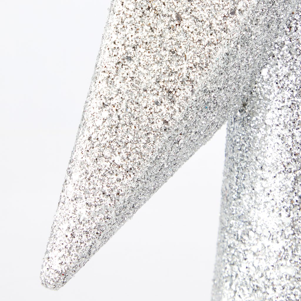 Ragyogó befejezés a karácsonyfád tetején: ez az ezüstszínű, csillogó glitterrel borított csúcsdísz klasszikus csillagformájával ünnepi fényt és eleganciát visz az otthonodba. Stabil rögzítőtalpának köszönhetően könnyen felhelyezhető, és garantáltan magára vonzza a tekinteteket.