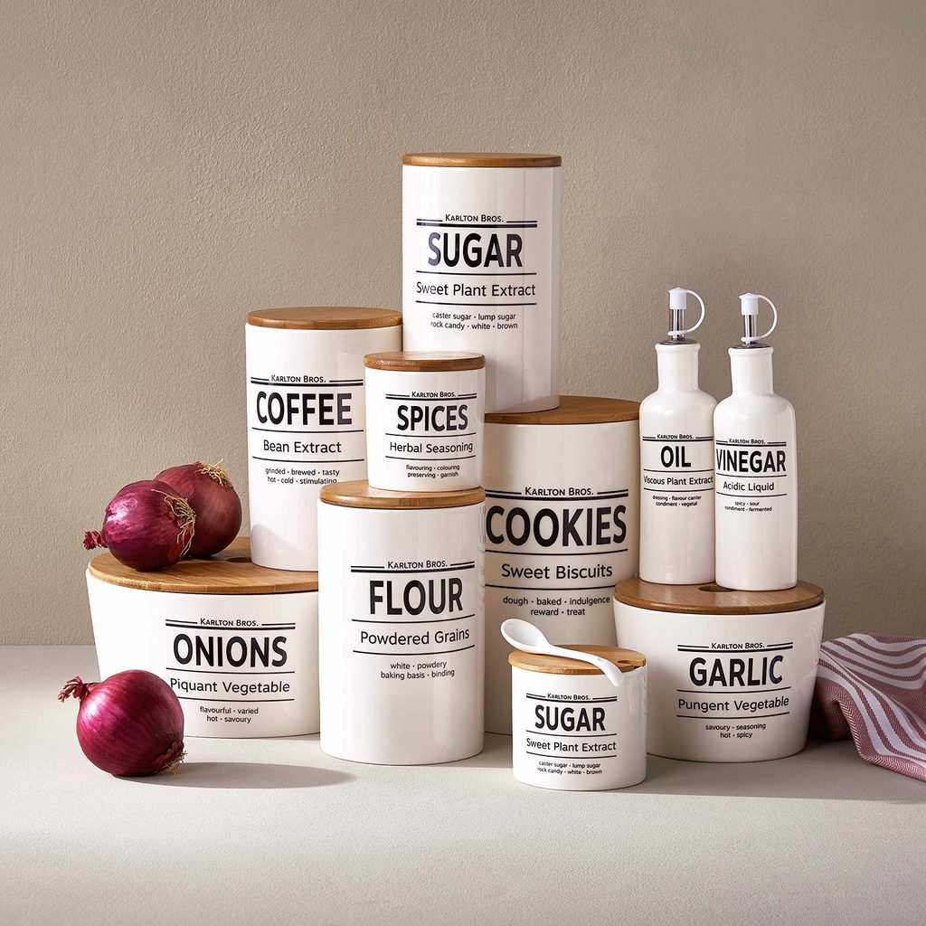 A vidéki Anglia hangulatát idéző porcelán KARLTON BROS. konyhai tárolóedények nem csak külsőre szemet gyönyörködtetőek, de praktikus kiegészítők is, melyek vigyázva őrzik a kávé, a cukor, az olaj vagy épp a kekszek zamatát a konyhában. A porcelán kávétartó bambusz teteje és szilikon zárója megvédi a kávét a nedvességtől, így őrzíve meg annak frissességét hosszú ideig. A sorozatban cukor-, liszt-, olaj-, ecet-, fokhagyma-, vöröshagyma-, fűszer-, keksz- és kávétartó található.