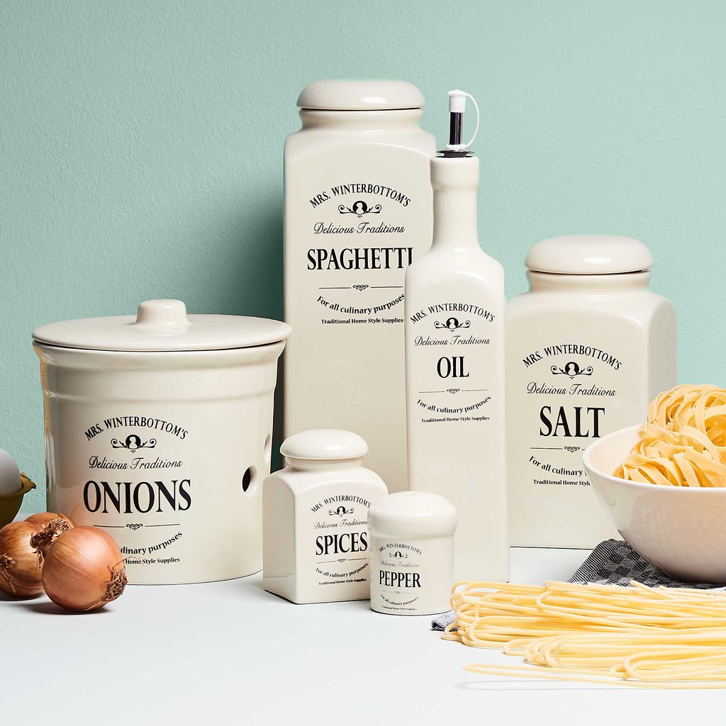 Egy hely mindennek és mindennek a maga helye – egy konyha sem lehet teljes a MRS. WINTERBOTTOM’S kerámiaedények nélkül! Kínálatunkban minden lehetséges konyhai eszköz megtalálható: a termékcsaládban fellelhető üvegek, fazekak, csuprok és fűszeres edények segítségével minden tárolható és felszolgálható. Minden egyes darab klasszikus angol díszítésekkel rendelkezik, mely kizárólag a BUTLERS számára készült és küllemre is tökéletesen illeszkedik egymáshoz.