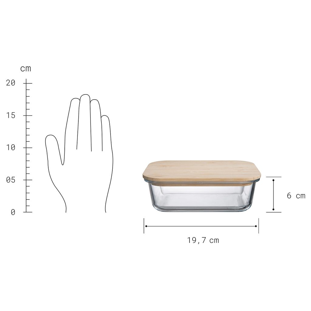 A bambusz fedéllel biztonságosan zárható üveg NATURALS tárolódobozban könnyedén magaddal viheted a szendvicset, salátát vagy akár egy különleges ebédet, így spórolva meg az eldobható csomagolóanyagokat. A tartósságról a boroszilikát üveg, míg a biztos záródásról a bambusz fedél gondoskodik - az üveg mosogatógépben mosható és mikrohullámú sütőben is használható, a bambusz fedelet azonban minden esetben előbb távolítsd el és csak kézzel tisztítsd. Többféle méretben elérhető.
