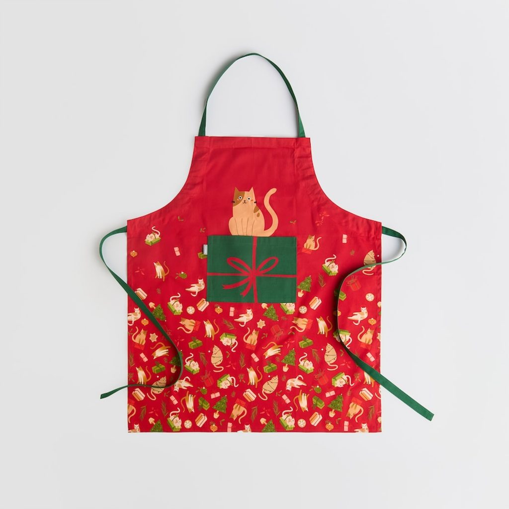 Ez a piros kötény játékos cicás mintáival és ajándékdobozos részleteivel vidám hangulatot visz a konyhába. A zöld pántok és a szórt díszítőelemek ünnepi lendületet adnak a sütés-főzésnek – tökéletes választás, ha a karácsonyi készülődés közben is szeretnél mosolyt csalni az arcokra.