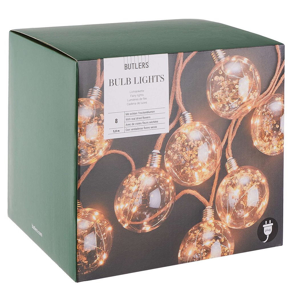 Tökéletes stílus: A legújabb BULB LIGHTS égősort a szárított virágokat magába záró 8 üveggolyó és az összesen 64 meleg fényű LED izzó teszi igazán különlegessé. A natúr színű juta kábel pedig már csak hab a tortán. A romantikus nyári esték vagy akár hangulatos esküvők tökéletes dekorációja lehet. Fali csatlakozóval működik.
