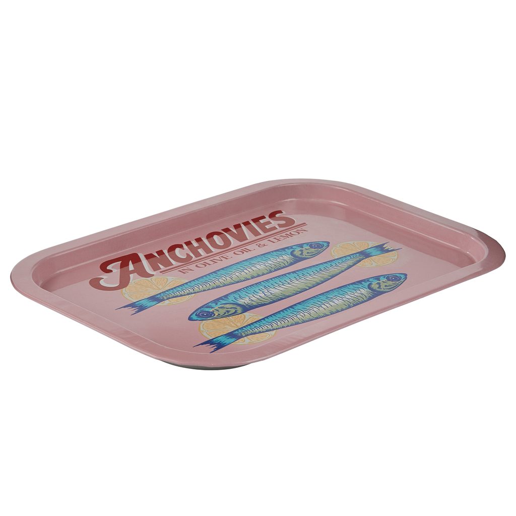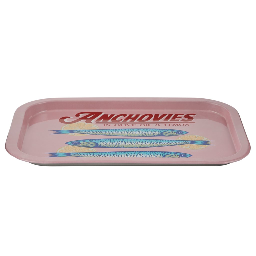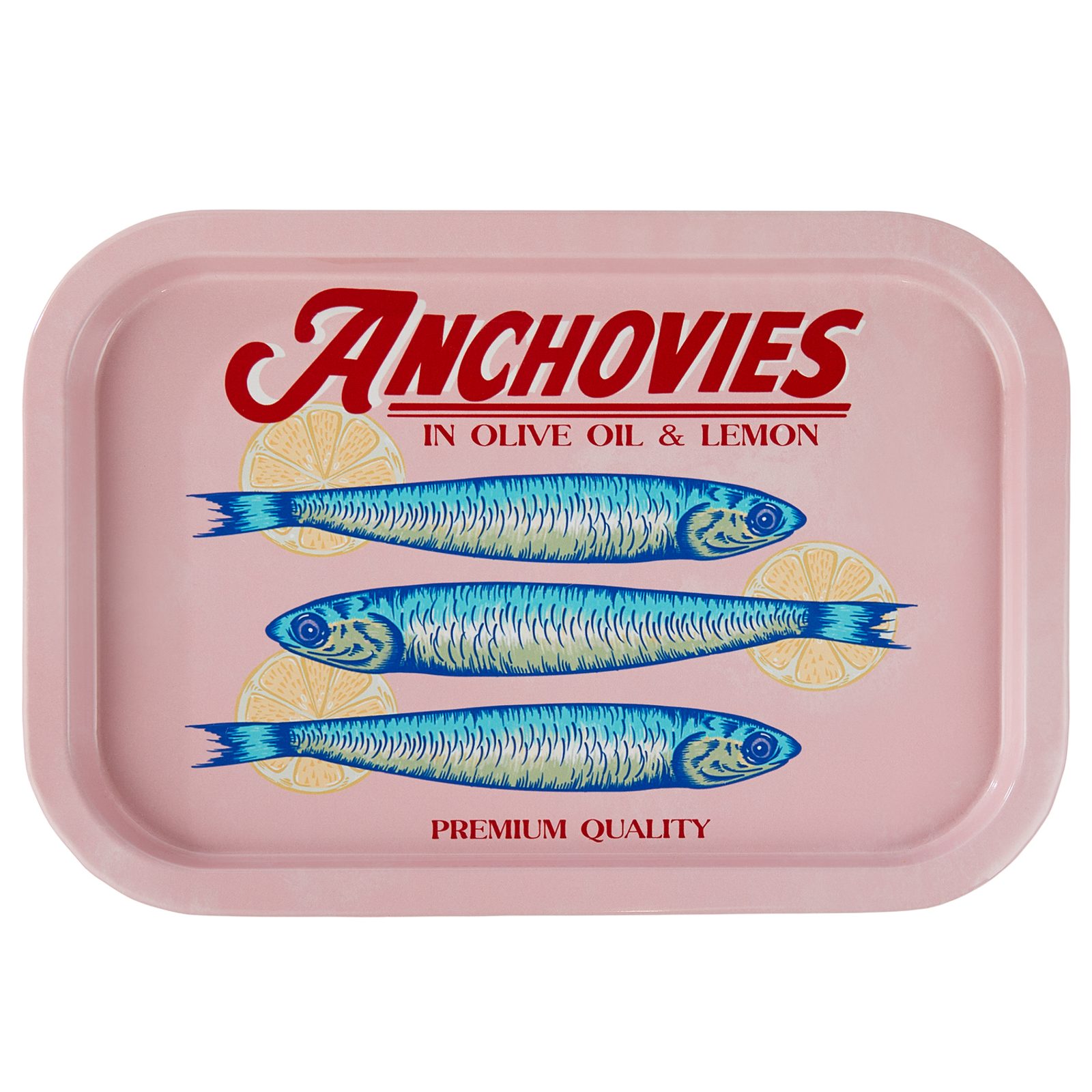 Ez a vidám, retro hangulatú rózsaszín tálca garantáltan feldobja a konyhát vagy a terítéket. A dekoratív „Anchovies in olive oil & lemon” grafikával és élénk színekkel díszített darab praktikus méretű, így tökéletes reggelihez, nassolnivalókhoz vagy egyszerűen stílusos lakásdekorációként. Könnyű, tartós és igazán egyedi kiegészítő.