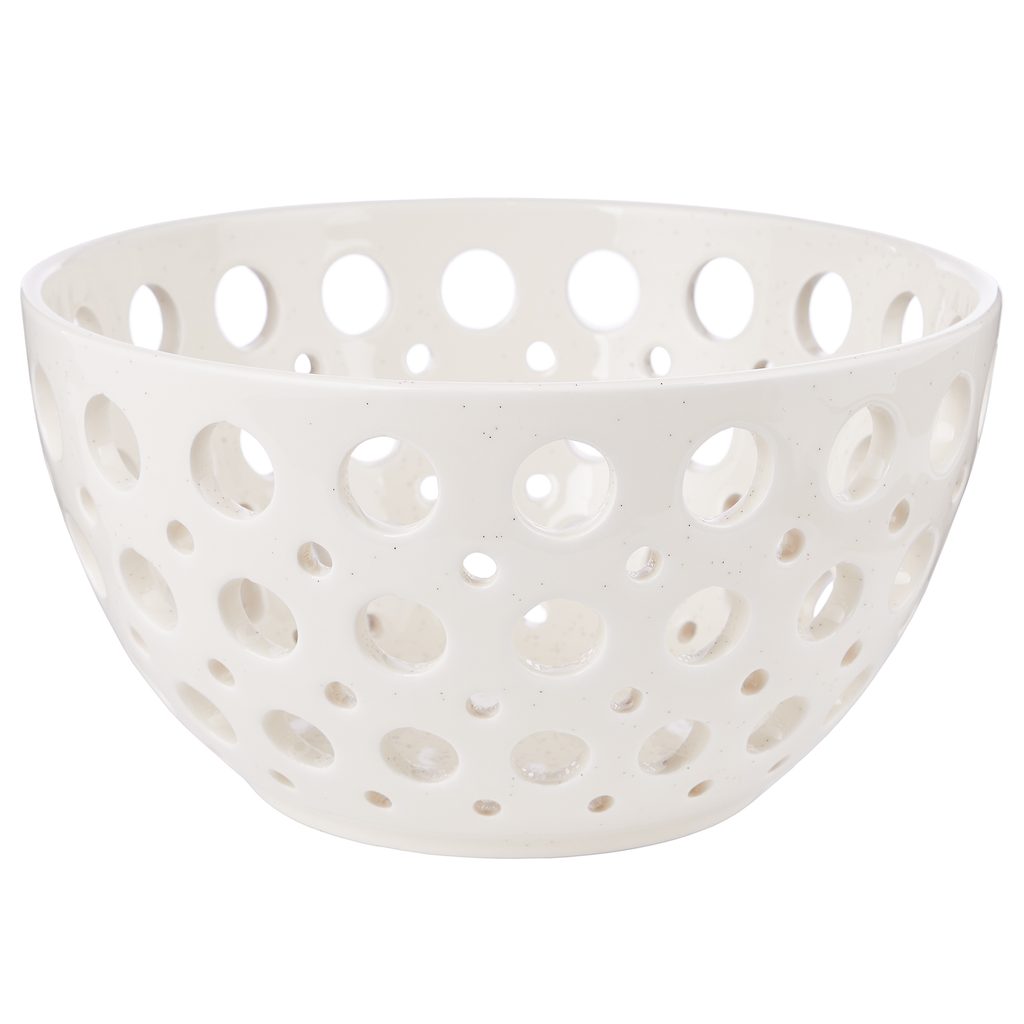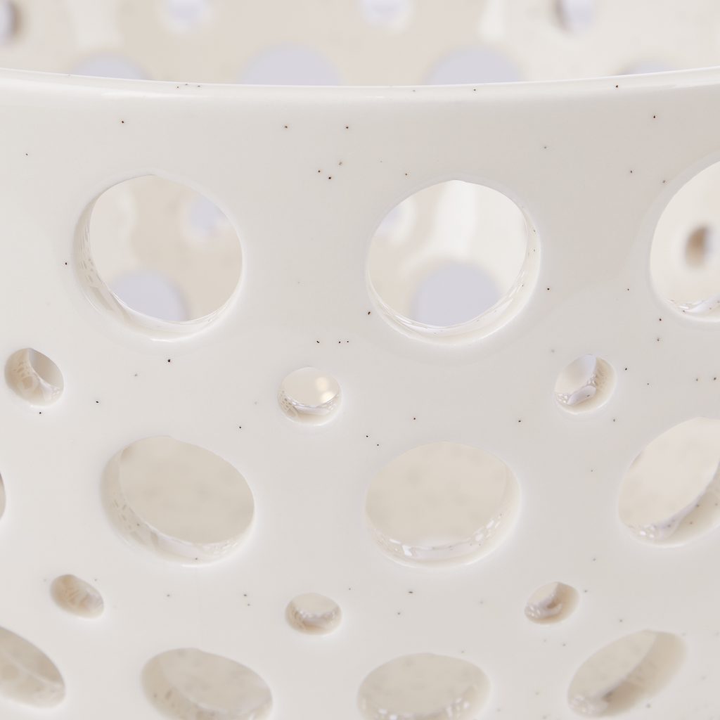 A Review dekoratív, lyukmintás dolomit tál igazán mutatós darab. Üresen hagyva érvényesül legszebben a finoman pettyezett felület és a perforált minta, de praktikus tárolóként is használhatod például kulcsoknak, töltőknek vagy egyéb apróságoknak. Dekorációs elemként is remekül működik: megtöltheted tobozokkal, húsvéti tojásokkal vagy más szezonális díszekkel. Két színváltozatban kapható.