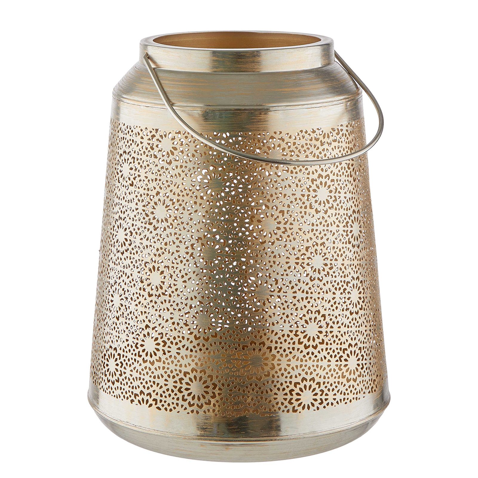 Lyukacsos minta, modern, kissé elkeskenyedő forma és csillogó arany felület: a BLOOMY LIGHTS lámpásban minden megvan, ami egy szemet gyönyörködtető dekorációhoz kell. A melegen csillogó és finoman átszűrődő gyertyafény pedig már csak a ráadás! Még egy méretben elérhető, kombinálásra is ideális.
