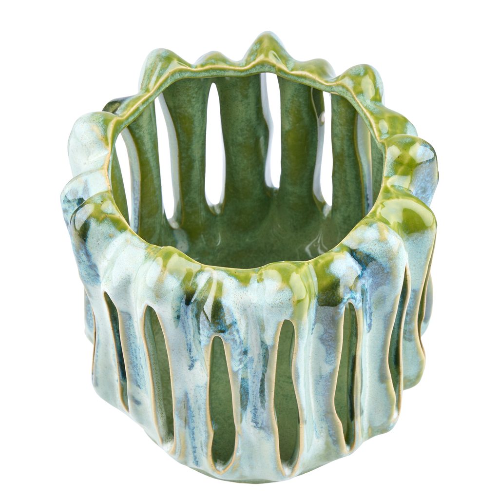 A természet ihlette fényjáték: a HAZY SHADES mécsestartó zöld, kék és fehér árnyalatú máza, valamint légies kivágásai különleges atmoszférát teremtenek. A 16,5 cm magas kerámia test organikus formája és hullámos pereme egyedi karaktert visz az enteriőrbe – legyen szó meghitt estékről vagy ünnepi dekorációról.