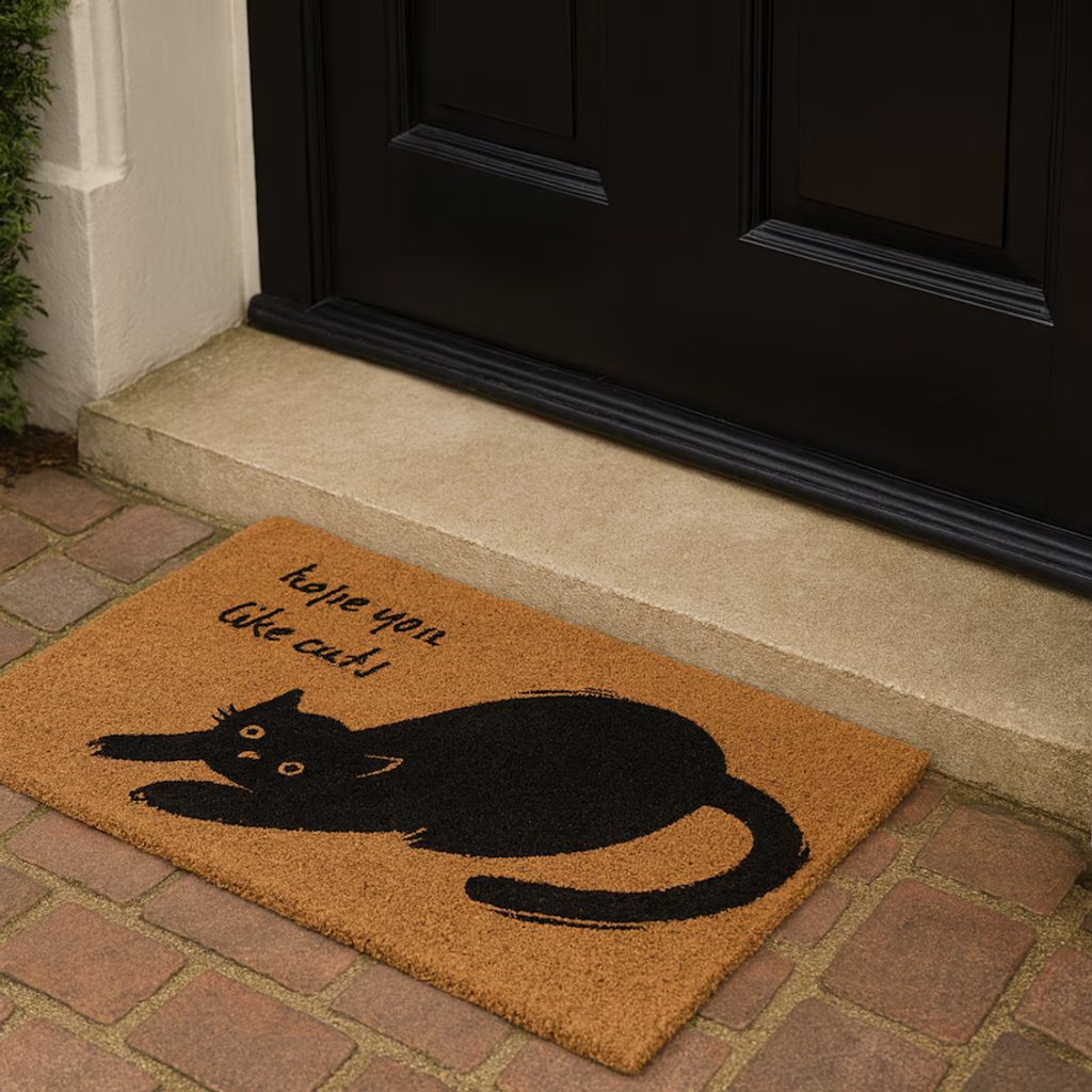 Ez a természetes kókuszrostból készült lábtörlő játékos cicás grafikájával és „Hope you like cats” feliratával már az ajtóban mosolyt csal az arcokra. Tökéletes választás minden macskakedvelő otthonába – praktikus, mégis személyes üzenettel fogadja a vendégeket.