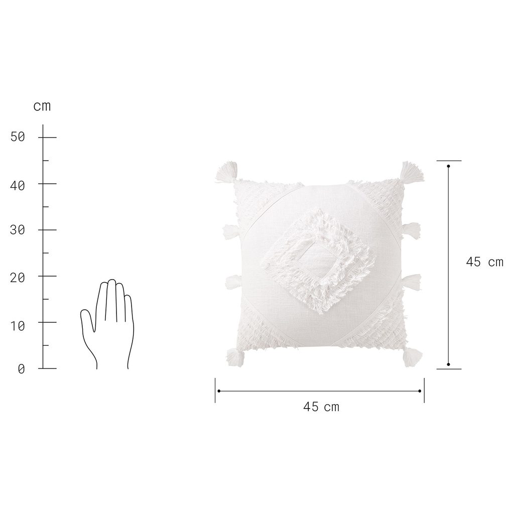 Bojtok és kreatív minta, mindez hófehér színben: a könnyedséget sugárzó MAYAN RIVIERA díszpárna garantáltan a kanapé vagy az ágy kedvenc tavaszi kiegészítője lesz!