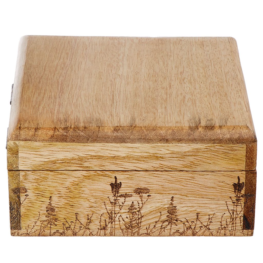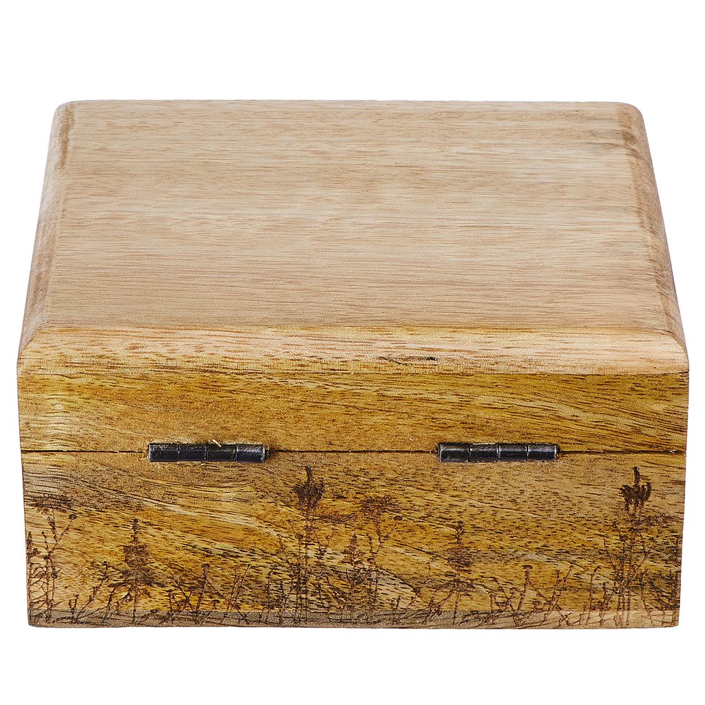 Elegáns virágok és füvek díszítik a mangófából készült FLOWER BOX ládikát, mely tökéletes apró tárgyak, például ékszerek és hajcsatok tárolására, de önmagában is igazi figyelemfelkeltő dekoráció a nappaliban, a hálószobában vagy a fürdőszobában. Még egy méretben kapható.