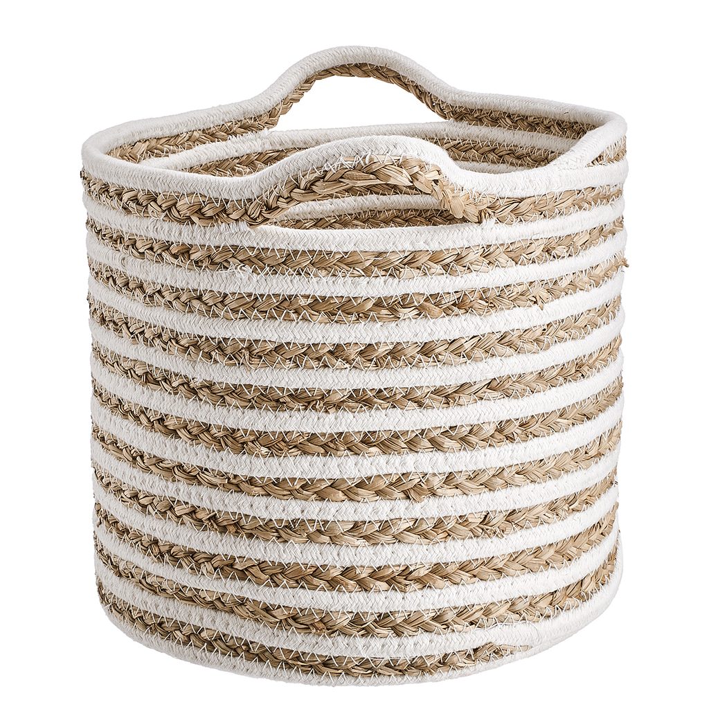 Natúrszínek fehér csíkokkal: a tengerifű és pamut kombinációjából készült COTTON BRAID kosárral a rendrakás és tárolás is élvezet. Többféle méretben kapható.