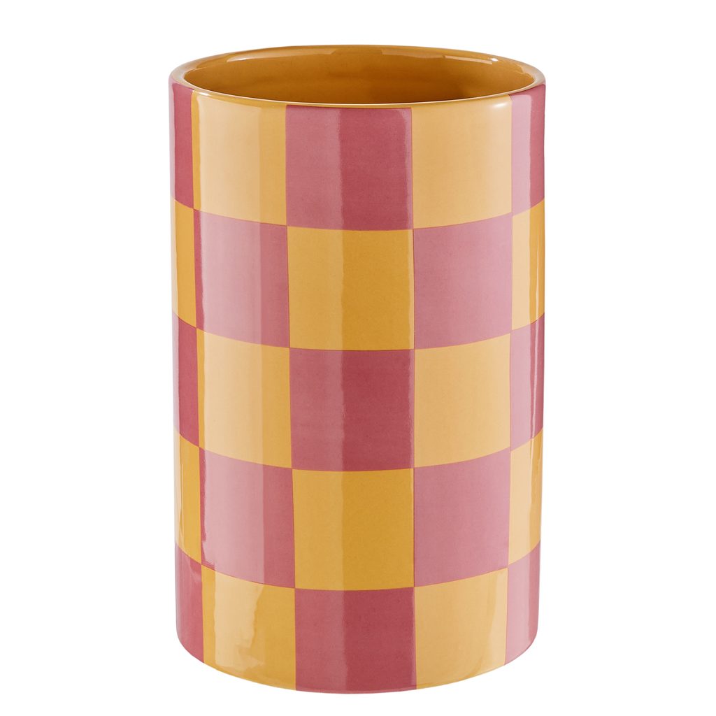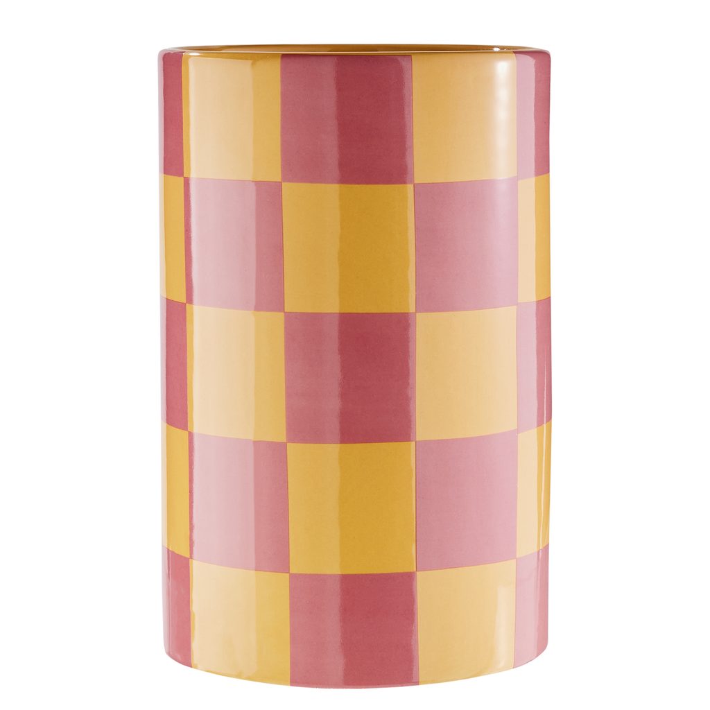 A CHECKER kerámia váza modern, karakteres darab, amelyet a sárga - és rózsaszín árnyalatokból álló, látványos sakktáblaminta tesz igazán különlegessé. Játékos megjelenése letisztult formával párosul, így egyszerre hat frissnek, kreatívnak és kortársnak. Akár virágokkal töltöd meg, akár önmagában állítod ki, garantáltan magára vonzza a tekintetet. Tökéletes választás komódokra, asztalokra vagy polcokra, és mindenkinek ajánlott, aki szereti a merész színeket és az egyedi dizájnt.