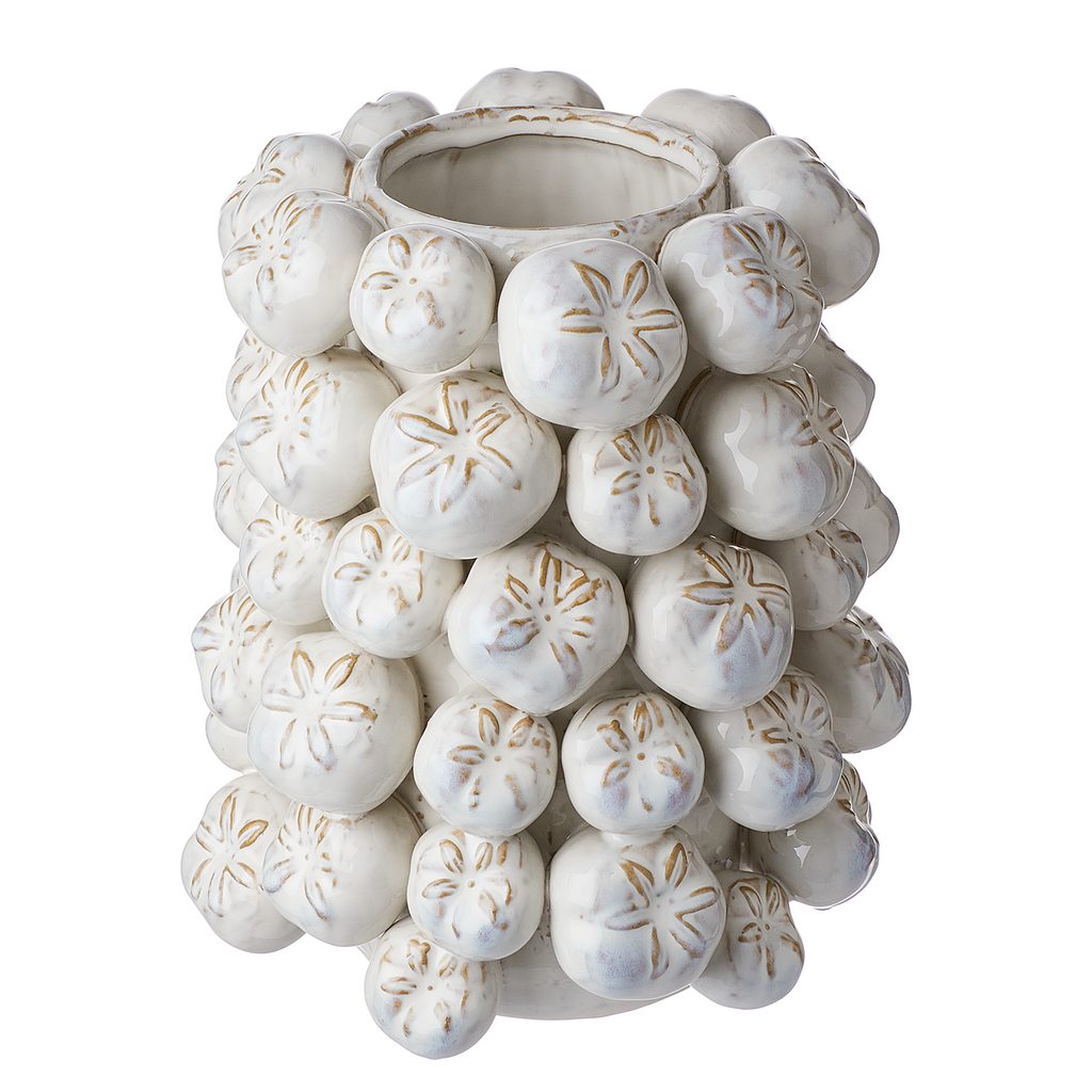 Sok stilizált 3D csipkebogyó díszíti a krémszínű kerámia ROSEHIP vázát. Ettől ez a rendkívüli váza szinte szoborrá válik, mely akár virágok nélkül is figyelemfelkeltő dísze lesz otthonodnak.