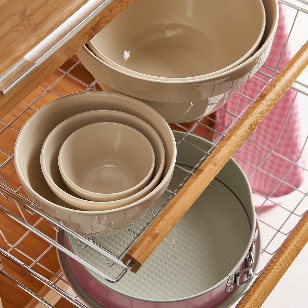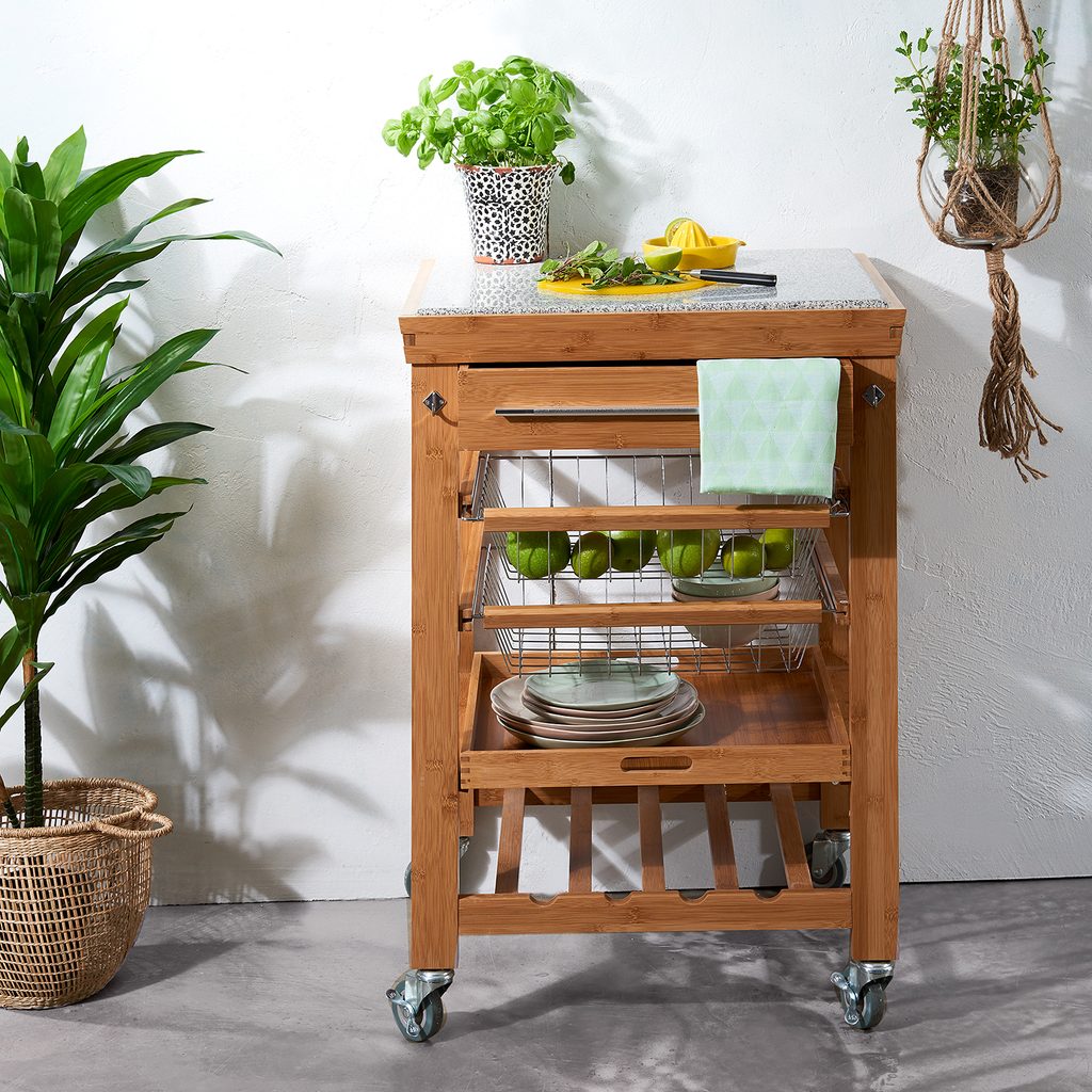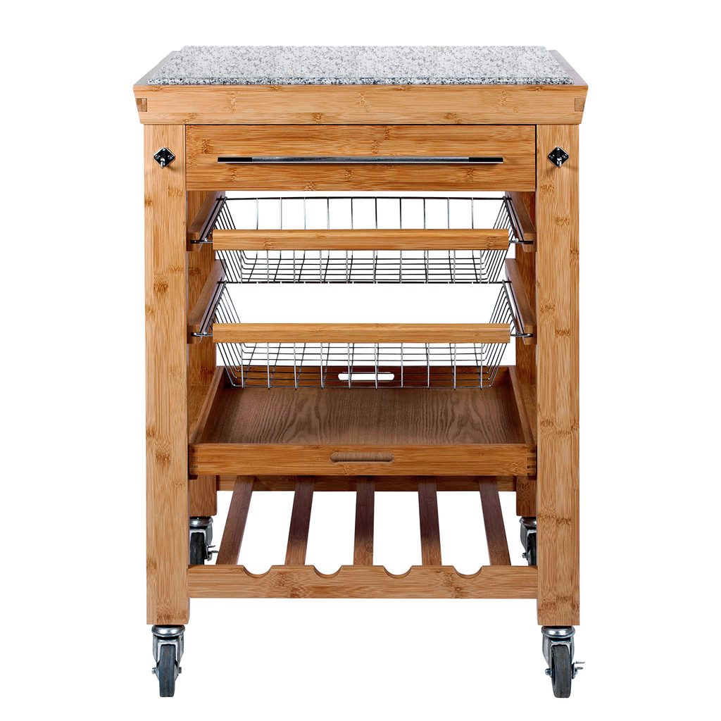 Kevés munkafelület a konyhában? Nincs elég tárolóhely? Még a legapróbb dolgok sem férnek el sehol? Semmi probléma! A ROLLING STONE zsúrkocsi mindig kéznél van, hogy segítse Önt a konyhai sürgés-forgásban. Igazán univerzális segítő; a tetején gránit vágólappal, fiókkal a konyhai eszközök számára, praktikus hálókosarakkal és üvegtartóval.