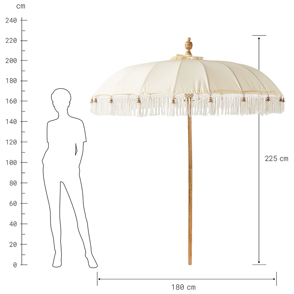Lazíts! A gyönyörű MACRAMÉ napernyővel a teraszra varázsolhatod a nyaralás könnyedségét. Ez a különleges minőségű napernyő hagyományos balinéz kézi munkával, kidolgozott részletekkel és játékos rojtokkal. Az esernyő szára, kerete és hegye pedig valódi mangófából készült. Helyezd magad kényelembe egy hűvös mango lassival, és élvezd a csodálatos pillanatot!