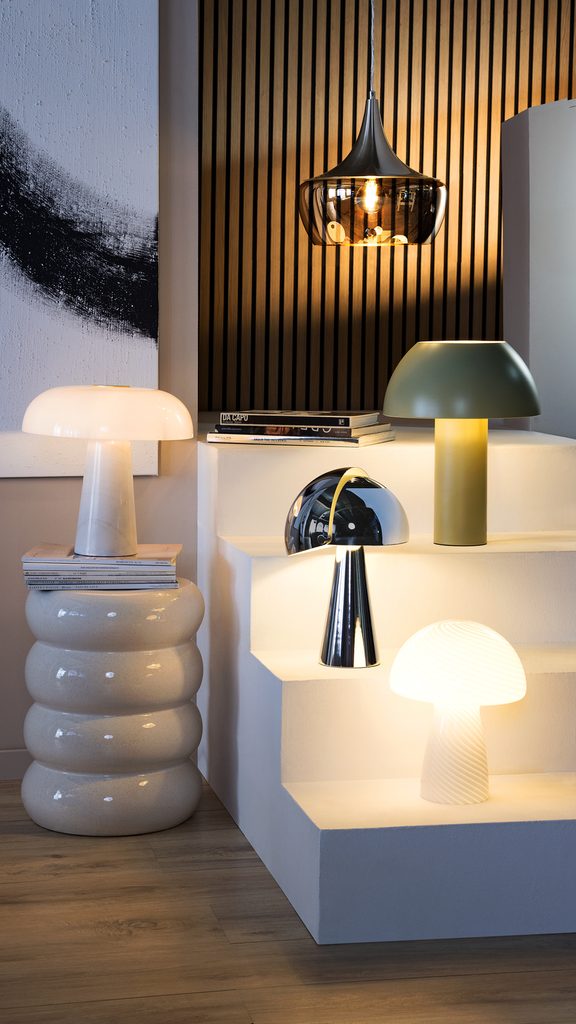 A finoman textúrált felület, a fényes üveg és a harmonikus gombaforma teszik elegánssá a modern FUNGI TOWN asztali lámpát. A fémes tónusok, a márvány és a fém éppúgy harmonizálnak ezzel a kiegészítővel, mint a pasztell színek és a letisztult belső terek. Többféle színben kapható.